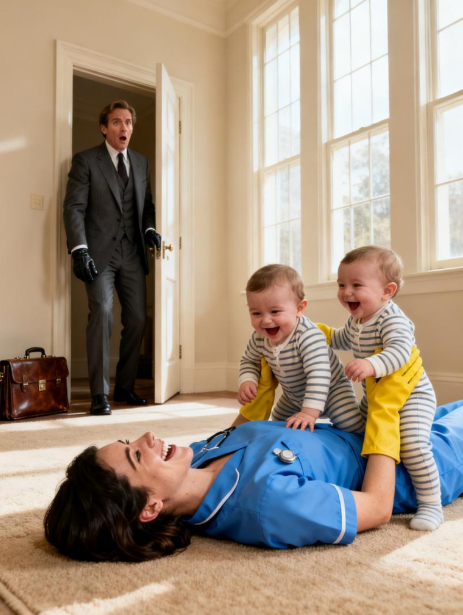 Au centre de la pièce, Élodie était allongée sur le tapis beige, en uniforme bleu vif, les mains gantées de caoutchouc jaune. Sur elle — littéralement sur elle — se tenaient les jumeaux, debout comme deux explorateurs victorieux.