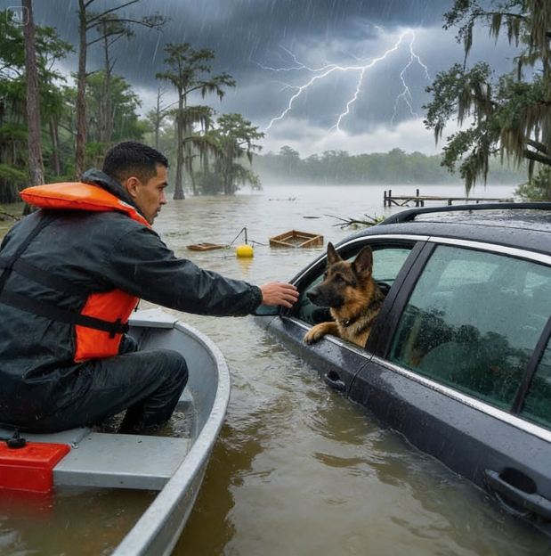 Sur le toit se tenait **un imposant berger allemand**. Trempé jusqu’aux os, les pattes largement écartées pour garder l’équilibre, il fixait non pas les sauveteurs… mais la voiture sous lui.